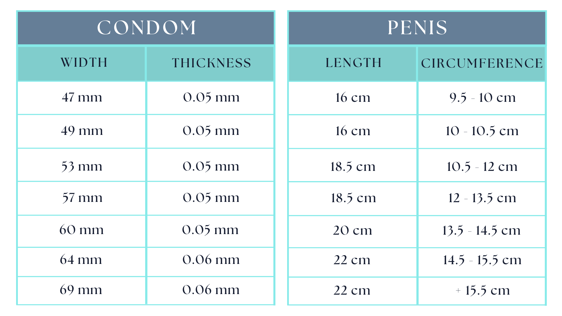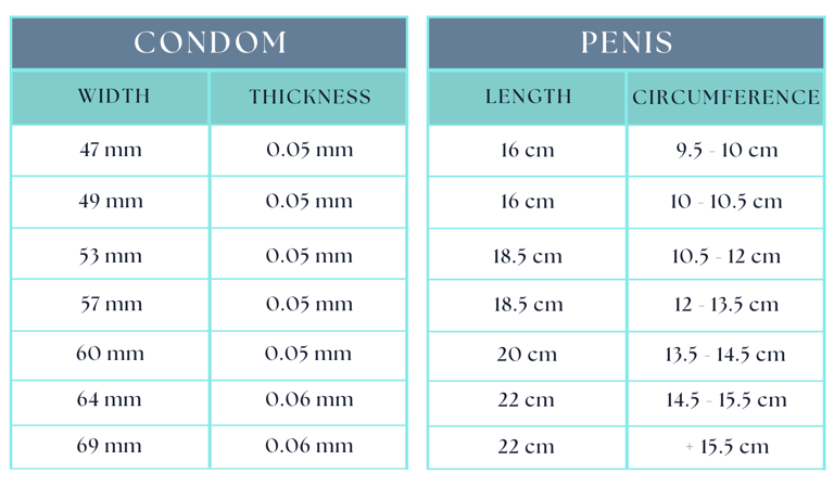 Sizes 47 and 49 will best suit those whose penis is about 16 centimetres in length and about 9.5 - 10.5 centimetres in circumference, and sizes 53 and 57 will best suit those whose penis is about 18.5 centimetres in length and about 10.5 - 13.5 centimetres in circumference. Size 60 will best suit those whose penis is about 20 centimetres in length and 13.5 - 14.5 centimetres in circumference, while sizes 64 and 69 will best suit those whose penis is about 22 centimetres in length and 14.5 - 15.5 centimetres in circumference.