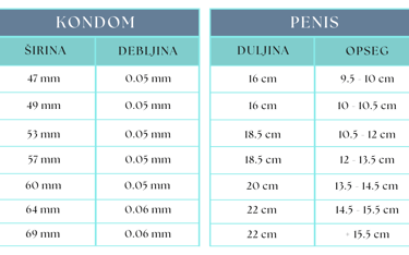 Veličine 47 i 49 najbolje će odgovarati onima čiji je penis duljine oko 16 i opsega oko 9.5 – 10.5 centimetara, a veličine 53 i 57 najbolje će odgovarati onima čiji je penis duljine oko 18.5 i opsega oko 10.5 - 13.5 centimetara. Veličina 60 najbolje će odgovarati onima čiji je penis duljine oko 20, a opsega oko 13.5 – 14.5 centimetara, dok će veličine 64 i 69 najbolje odgovarati onima čiji je penis duljine oko 22, a opsega oko 14.5 – 15.5 centimetara.